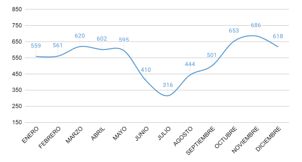 leve descenso en abril (602) y mayo (595). A partir de junio se observa una caída